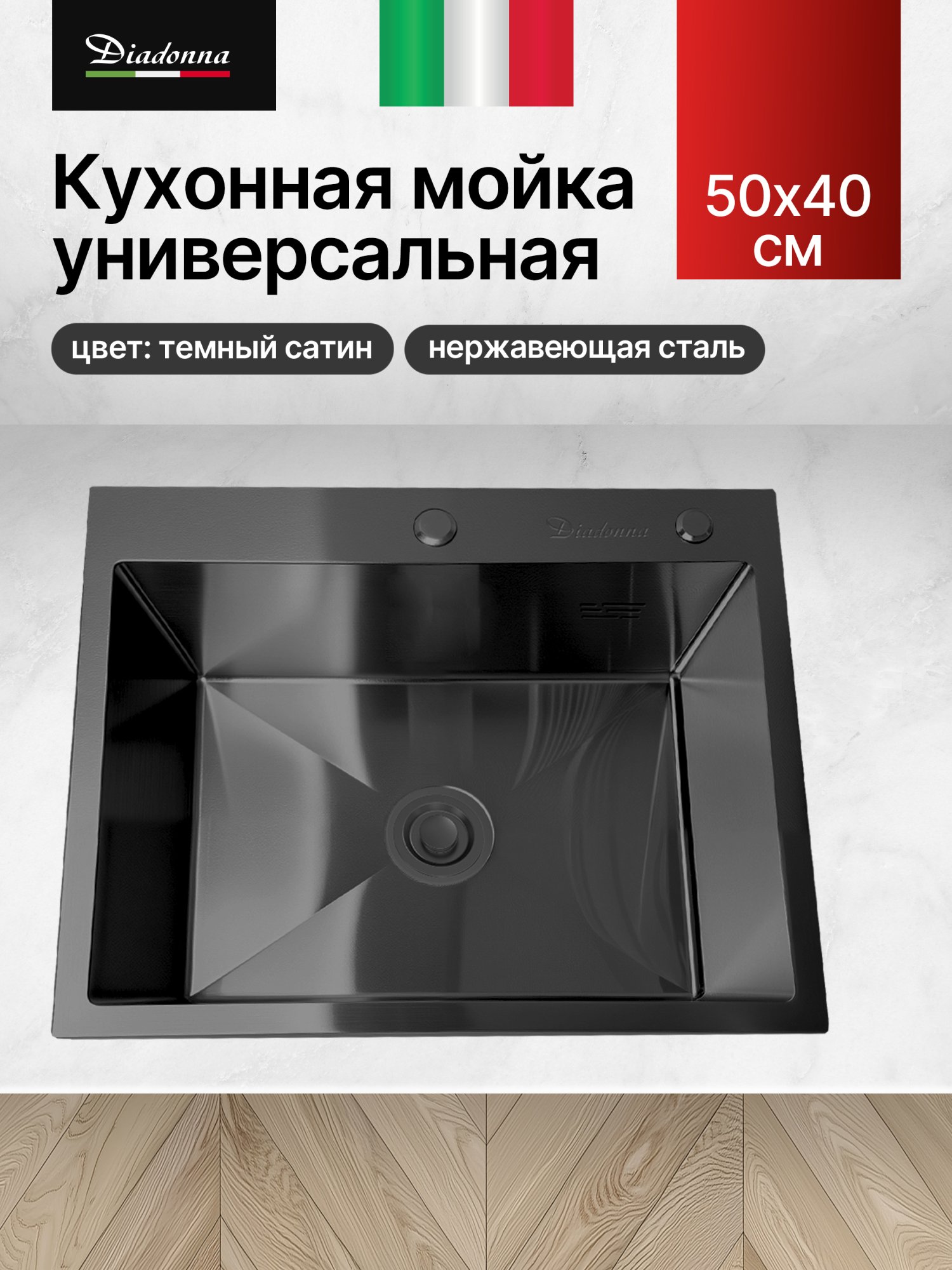 Мойка кухонная из нержавеющей стали темный сатин Diadonna 50 — это идеальное решение для вашей кухни, сочетающее в себе стильный дизайн и функциональность. Если вы ищете надежную и практичную мойку для кухни, то эта модель станет отличным выбором. Изготовленная из высококачественной нержавеющей стали, она не только устойчива к коррозии, но и легко очищается, что делает её незаменимой в любом домашнем хозяйстве. Эта накладная мойка отличается элегантным темным сатиновым покрытием, которое придаст вашей кухне современный и ухоженный вид. Многофункциональная конструкция позволяет с легкостью мыть посуду, готовить и выполнять другие кухонные задачи. Размер 50х40 см идеально подойдет для компактной кухни, а также в сочетании с различными кухонными гарнитурами. В дополнение к эстетическим качествам, мойка имеет продуманную систему слива, что обеспечивает быстрое удаление воды и предотвращает засоры. Для удобства использования предусмотрен сифон для раковины, который легко устанавливается и обслуживается. Если вы хотите дополнить свой кухонный комплект, обратите внимание на аксессуары, такие как решетка для раковины и дозатор моющего средства, которые сделают процесс мытья посуды еще более комфортным. Эта раковина для кухни станет не только практичным элементом, но и стильным акцентом в вашем интерьере. Устойчивость к механическим повреждениям и легкость в уходе делают мойку из нержавейки идеальным выбором для активного использования. Вы можете быть уверены, что она прослужит вам долгие годы, сохраняя свой первоначальный вид. Если вы ищете качественную сантехнику для кухни, мойка из нержавеющей стали Diadonna 50 — это то, что вам нужно. Она прекрасно впишется в любой кухонный гарнитур и станет надежным помощником в повседневных делах. Не упустите возможность сделать вашу кухню более функциональной и стильной с помощью этой многофункциональной мойки. Закажите свою новую раковину уже сегодня и наслаждайтесь комфортом на кухне!делайте ваш кухонный гарнитур завершенным и функциональным с этой многофункциональной мойкой!