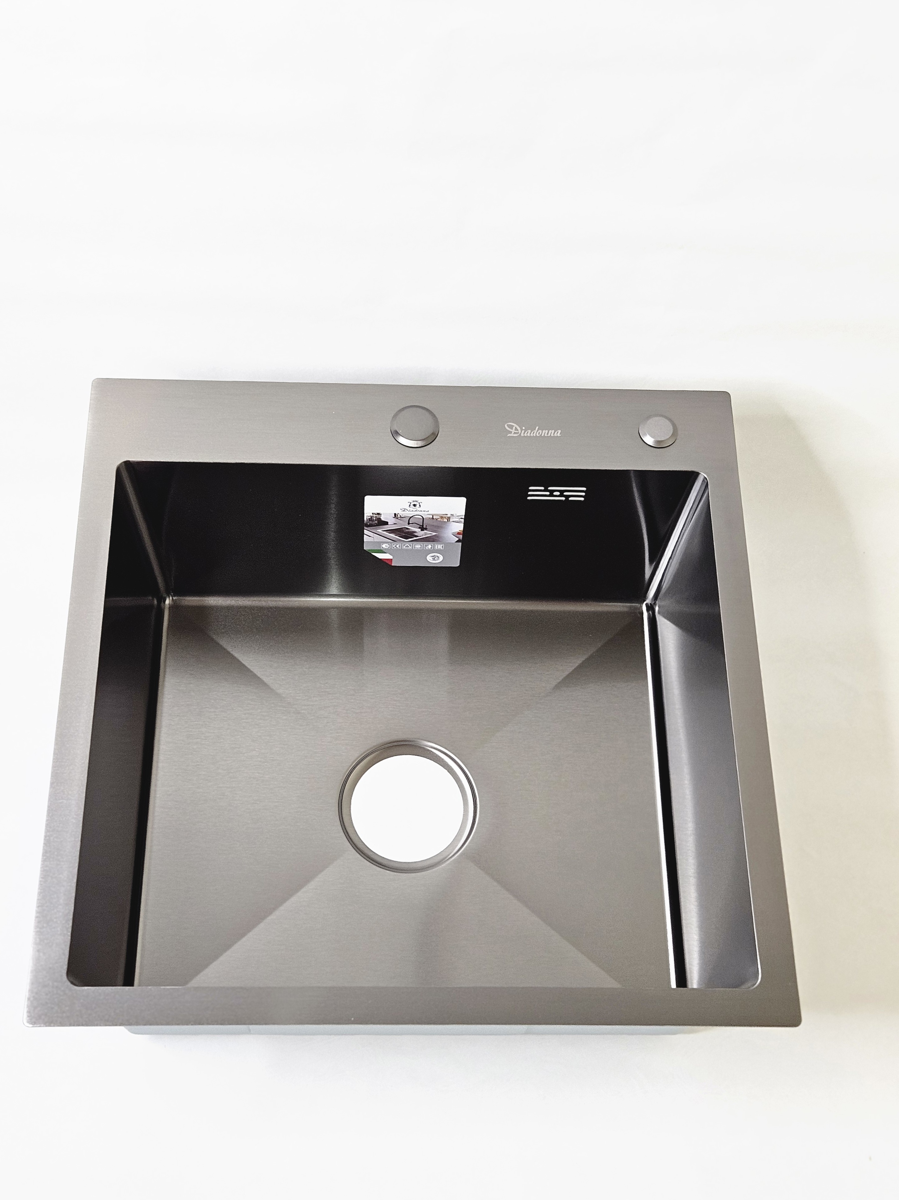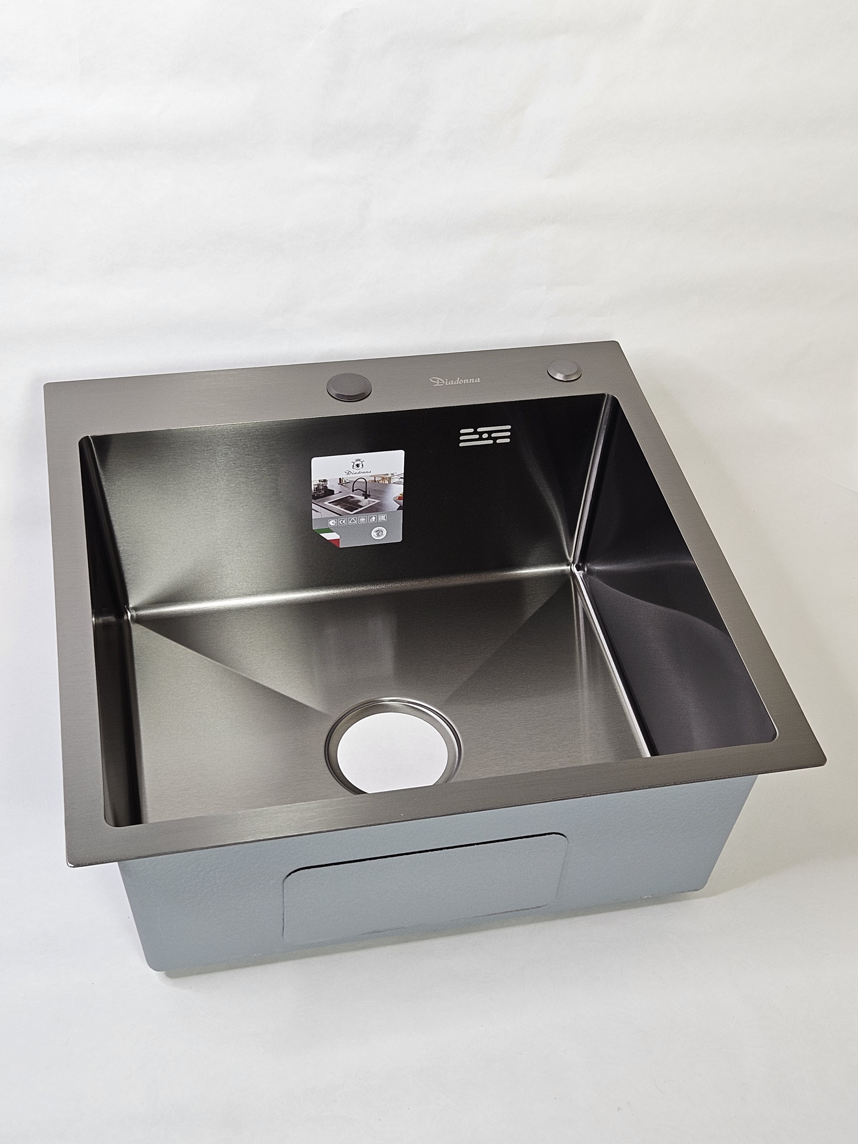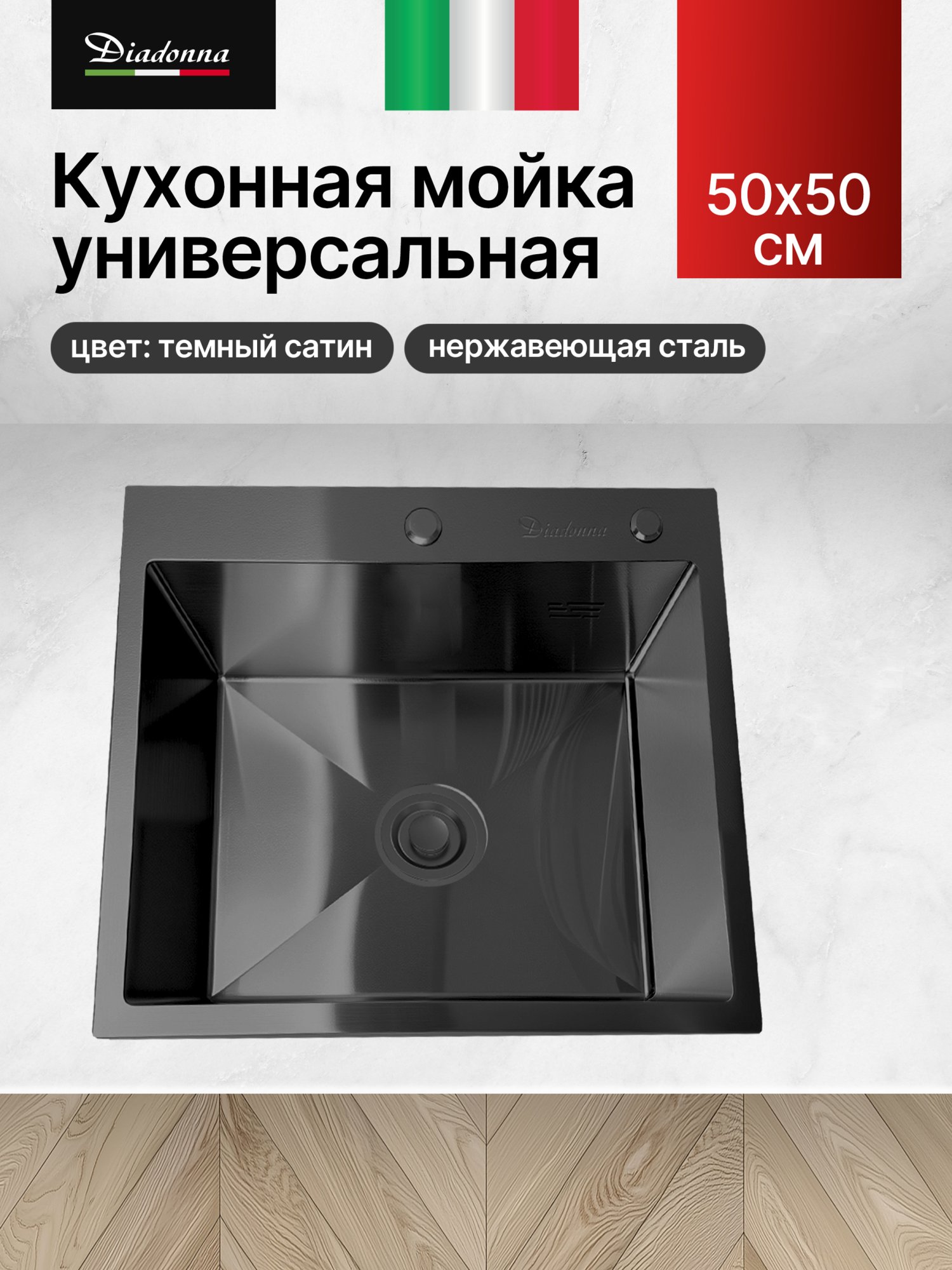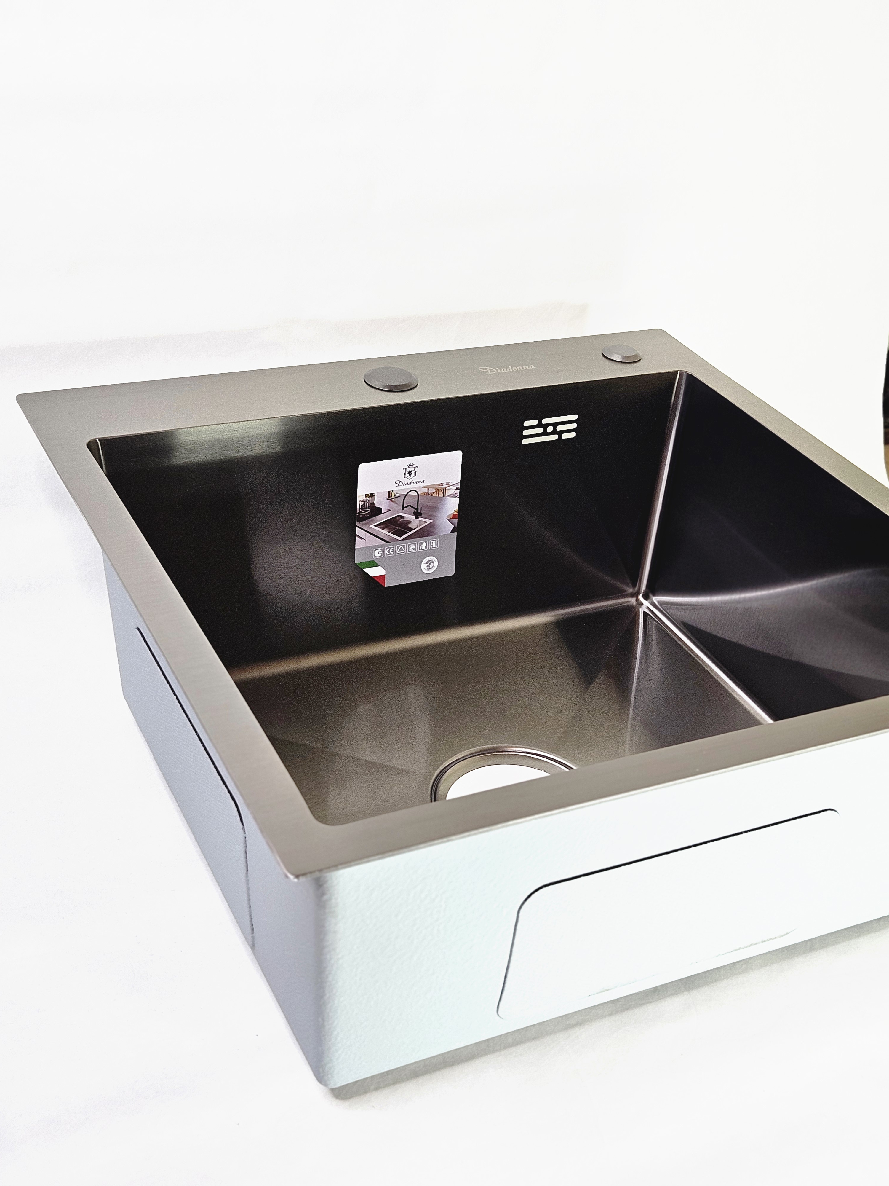 Кухонная мойка из нержавеющей стали черного цвета Diadonna 50x50 — это идеальное решение для вашего кухонного пространства. Она сочетает в себе стильный дизайн и высокую функциональность, что делает ее незаменимым элементом в любом гарнитуре. Благодаря своему универсальному размеру, эта накладная раковина легко впишется в различные интерьеры, будь то современный или классический стиль. Изготовленная из качественной нержавеющей стали, мойка отличается долговечностью и устойчивостью к коррозии. Это значит, что она прослужит вам долгие годы, сохраняя свой первоначальный вид и функциональность. Мойка для кухни Diadonna не только практична, но и эстетична: черный цвет придаст вашей кухне особый шарм и элегантность. Многофункциональная мойка идеально подходит для выполнения различных задач на кухне. Вы сможете без труда мыть посуду, овощи и фрукты, а также использовать ее в качестве рабочей поверхности. В комплекте с раковиной предусмотрен слив для раковины и сифон, что делает установку простой и быстрой. К тому же, мойка оснащена специальной решеткой, которая предотвратит засорение и упростит уход за ней. Эта раковина для кухни станет отличным дополнением к вашему кухонному гарнитуру. Если вы ищете надежную и красивую мойку, которая будет радовать вас каждый день, то мойка из нержавейки Diadonna — это именно то, что вам нужно. Она отлично сочетается с различными столешницами и аксессуарами, такими как дозатор моющего средства и сушилка для посуды, что делает вашу кухню еще более удобной и функциональной.